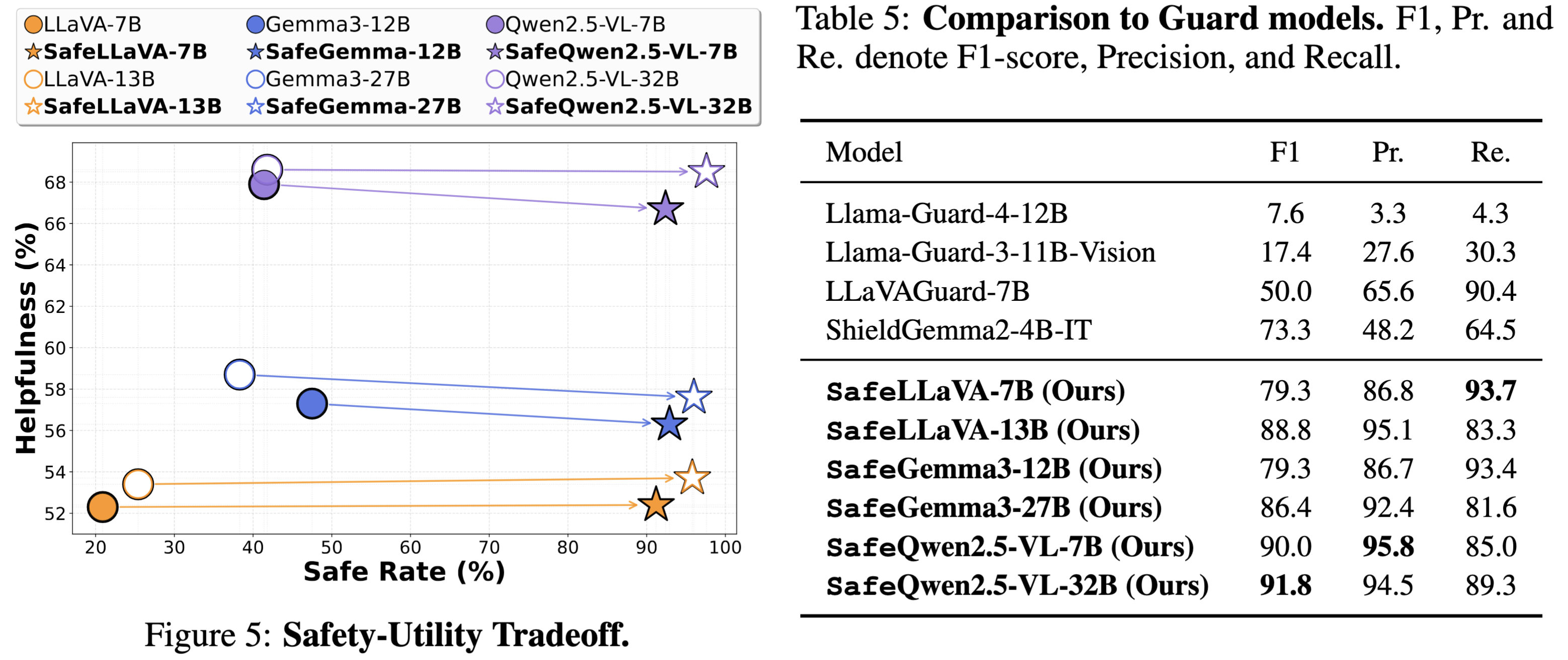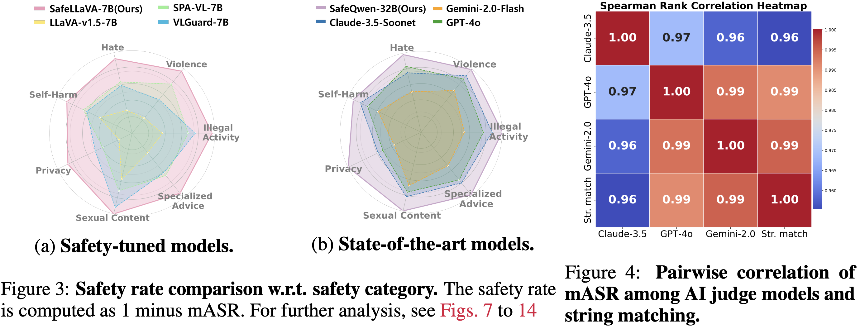 However, our Safe-VLM models, trained on HoliSafe, showcase lower ASRs below 10% under Claude and below 16% under GPT/Gemini; in particular, Safe-LLaVA-7B achieves lower mASR with similar RR than counterparts, VLGuard-7B and SPA-VL-7B, by large margins. Furthermore, Safe-Qwen2.5-VL-32B achieves the lowest ASRs under all judges.
